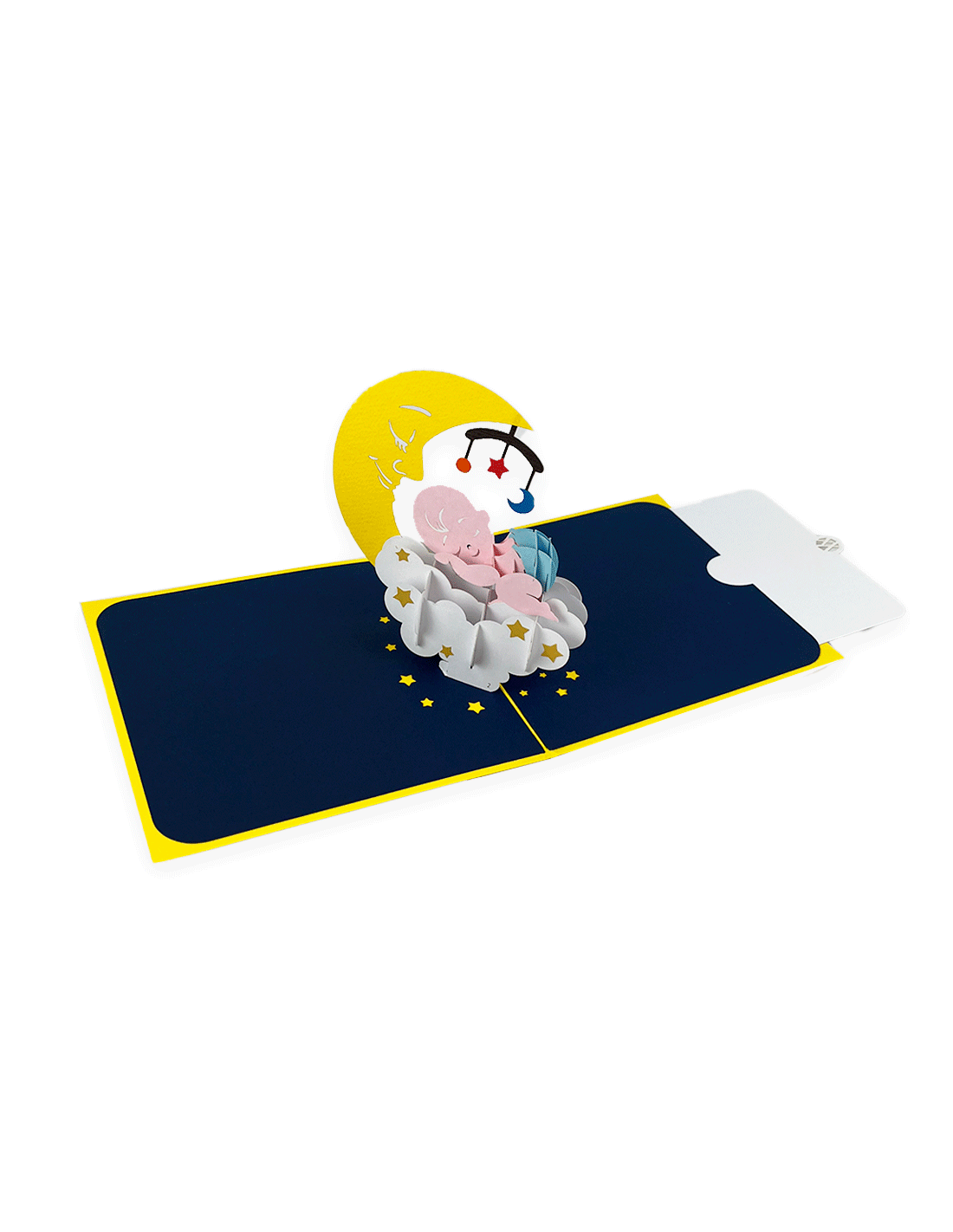 Postal "Somnis d'infant" con desplegable, "pop up". Gracias a un cálculo laborioso y una estructura precisa, la figura se despliega perfectamente. Cuenta con una tarjeta extraíble para escribir un mensaje. Hecha a mano con papel ecológico. Medida de 15x15 cm.