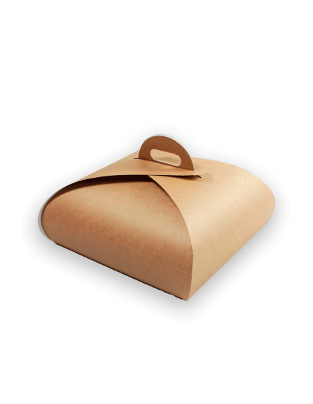 Caja kraft para pastelesde 10x10x9 cm con asas. Práctica, resistente y elegante para porcionesindividuales y pequeños postres.