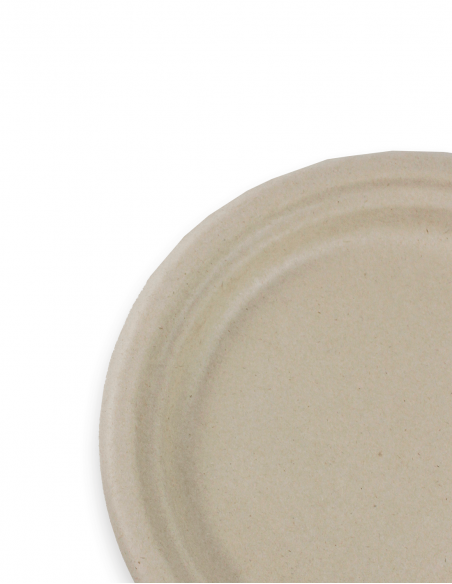 Plato de caña de azúcar en color crema. Medida de 26 cm de diámetro. 100% compostable. Paquete de 50 unidades.