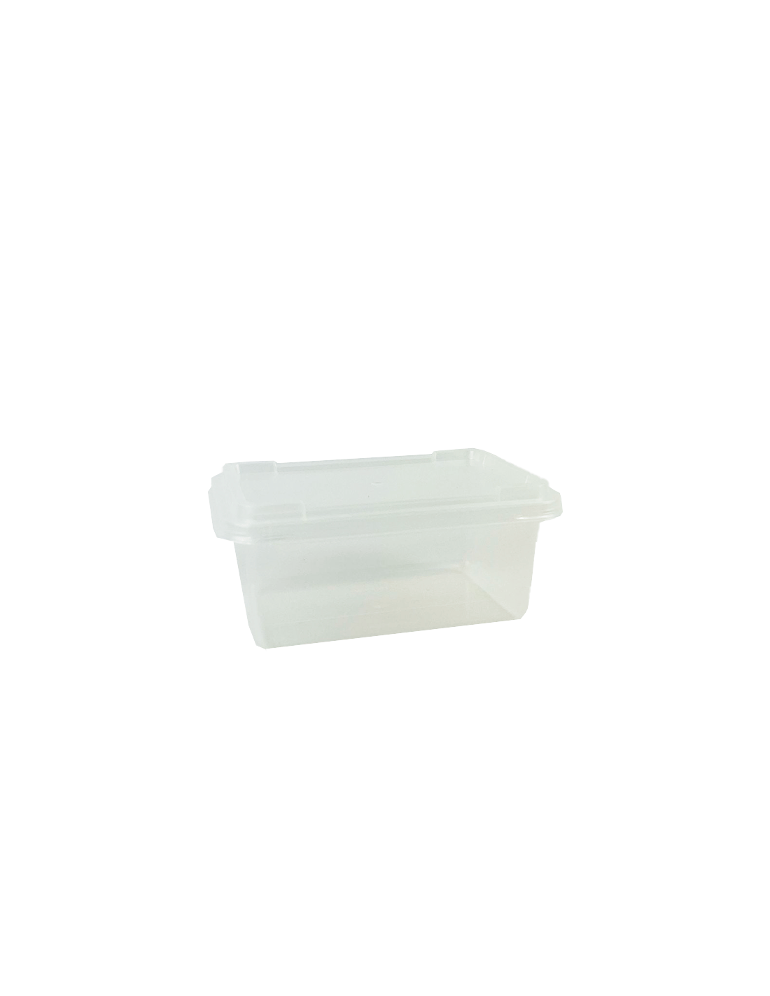 Tarrina rectangular con tapa. Medida de 10,5x6,5x5cm. Transparente y de plástico. Paquete de 5 unidades.
